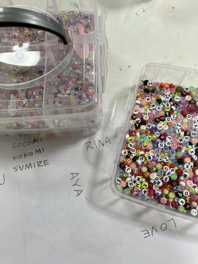 輝け未来!ヒーロー研究室 2026年3月15日2026年3月18日 ビーズで遊ぶ Posted By: art-community art, children, childrenart, アートクラブ子どものちから, ヒーロー研究室, ビーズ, フォレスト三日市, 子どもの居場所, 子ども絵画, 河内長野, 特定非営利活動法人アートコミュニティ ✓ ヒーロー研究室では、ビーズをいっぱい用意しています。女の子は、ビーズが大好き。量の限定を兼ねて、ブレスレットを作る事にしている。金・銀のビーズ用のゴムに、好きなビーズを通して作っていきます。(時々、男子も作ることも。)英文字で名前を綴りたい。のリクエストが多い。自分の名前を、英文字を探すのもちょっとした、ドキドキです。 ビーズでブレスレット ローマ字で名前は?